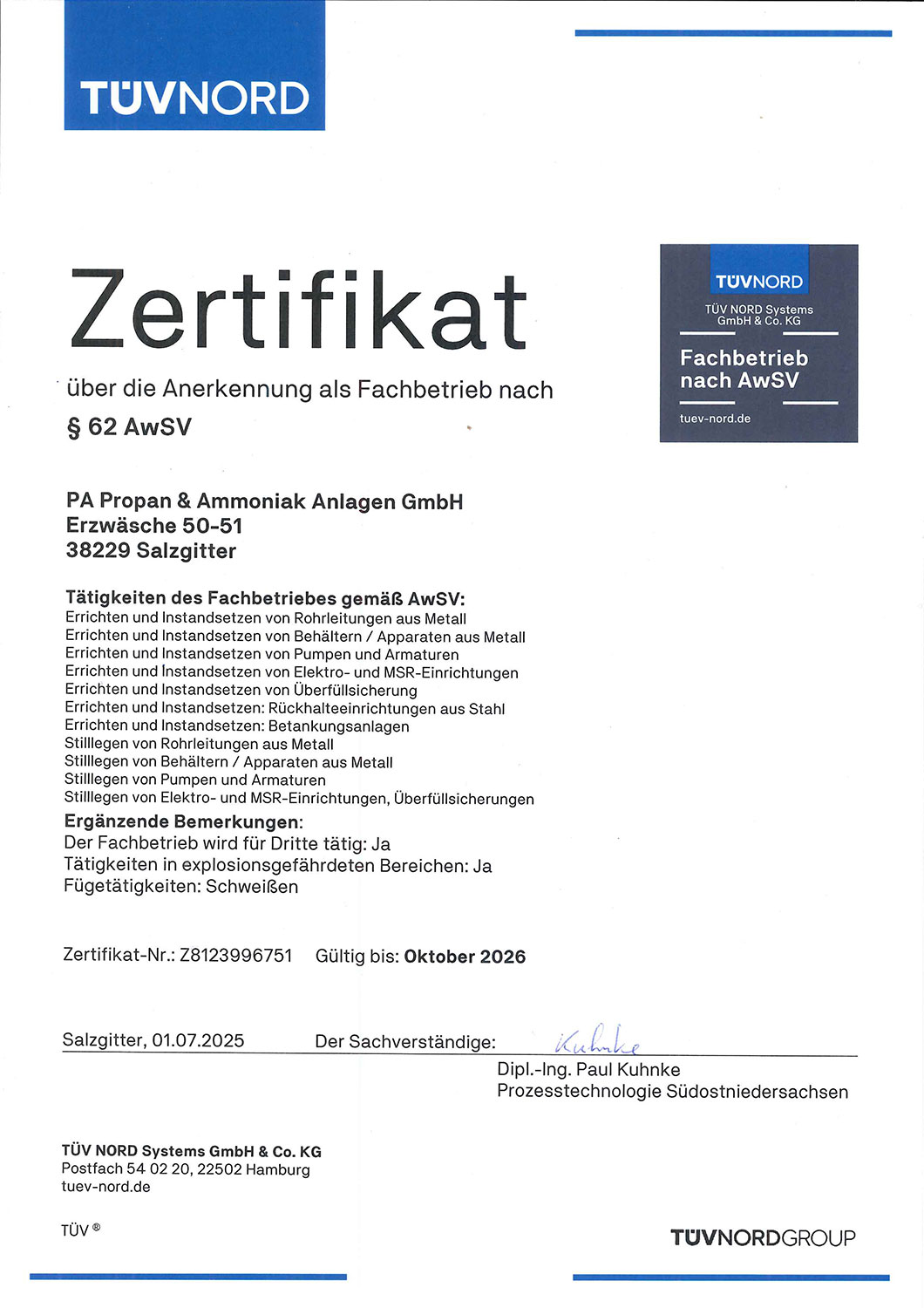 Tätigkeiten an Anlagen zum Umgang mit wassergefährdenden Stoffen dürfen gemäß Wasserhaushaltsgesetz (WHG) nur von dafür qualifizierten Fachbetrieben ausgeführt werden.